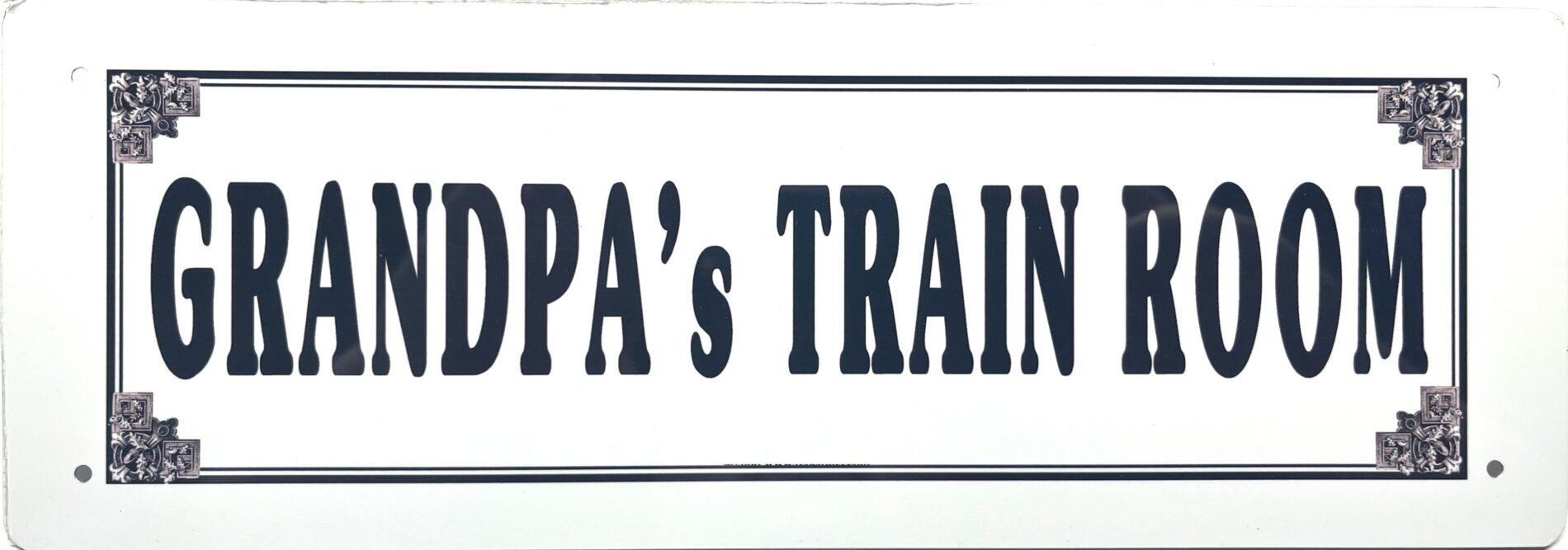 Grandpa’s Train Room Railroad Sign is a perfect gift for Grandpa. Holiday time, birthday or retirement gifts for the railroaders. Metal measures 4″ x 11 1/2″, with rounded corners and an 1/8″ hole punched in each corner. Metal is .025 gauge aluminum.